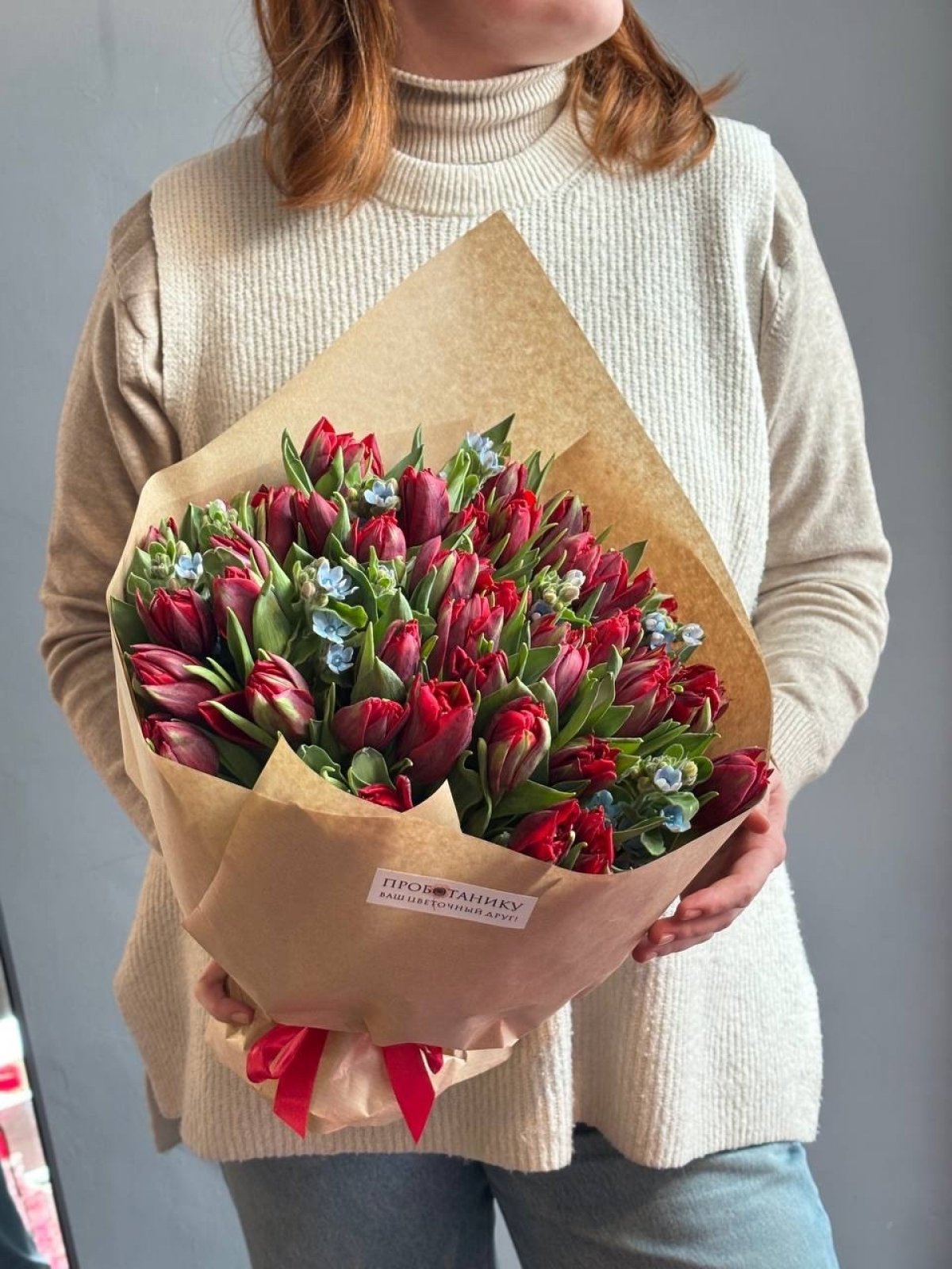 Букет из 51 пионовидного тюльпана с незабудками от флористов цветочного пространства "ПРОБОТАНИКУ".
