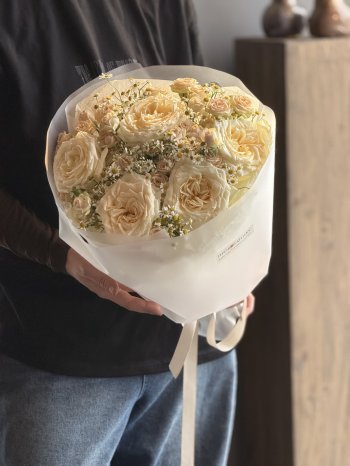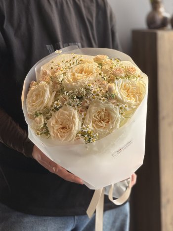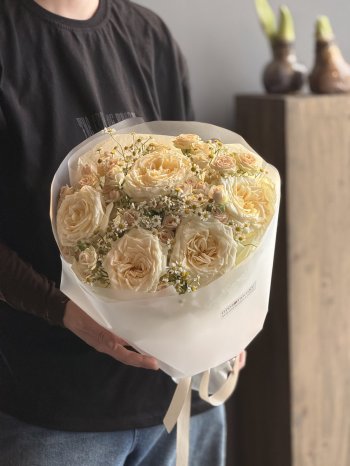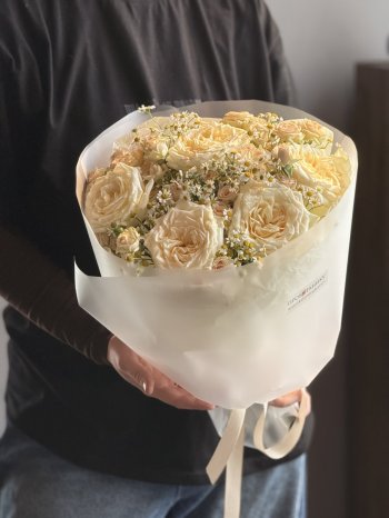Букет с пионовидными розами и кустовыми ромашками от флористов цветочного пространства "ПРОБОТАНИКУ".