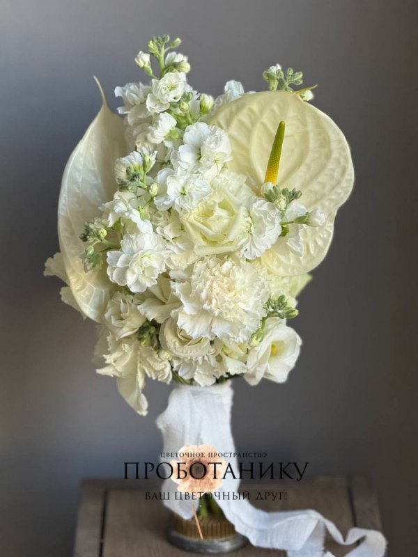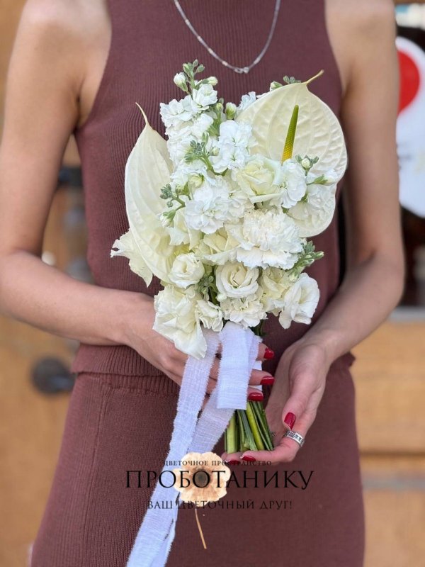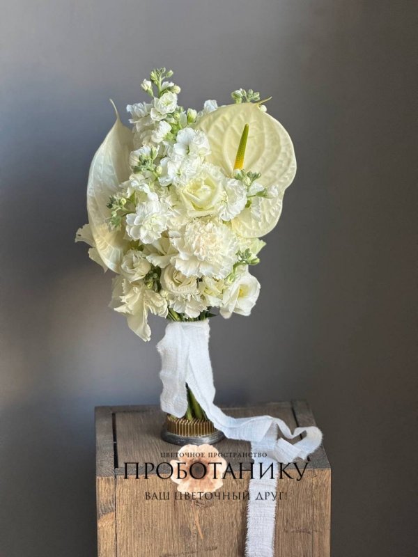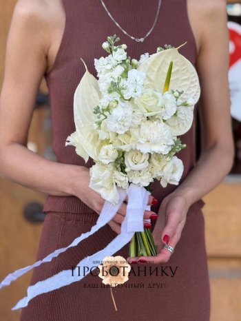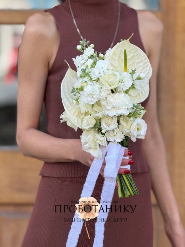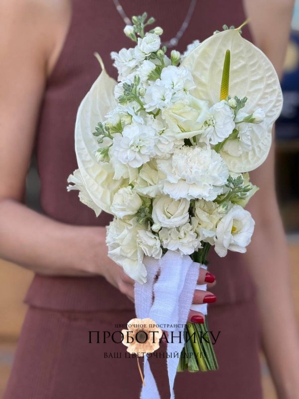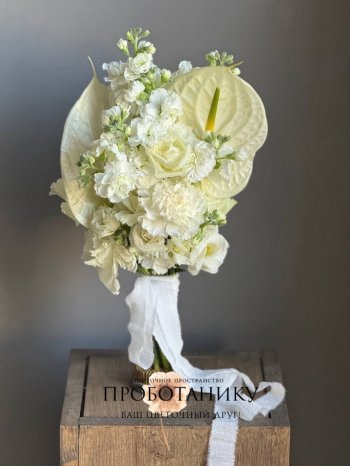 Букет невесты с белыми антуриумами от флористов цветочного пространства "ПРОБОТАНИКУ".