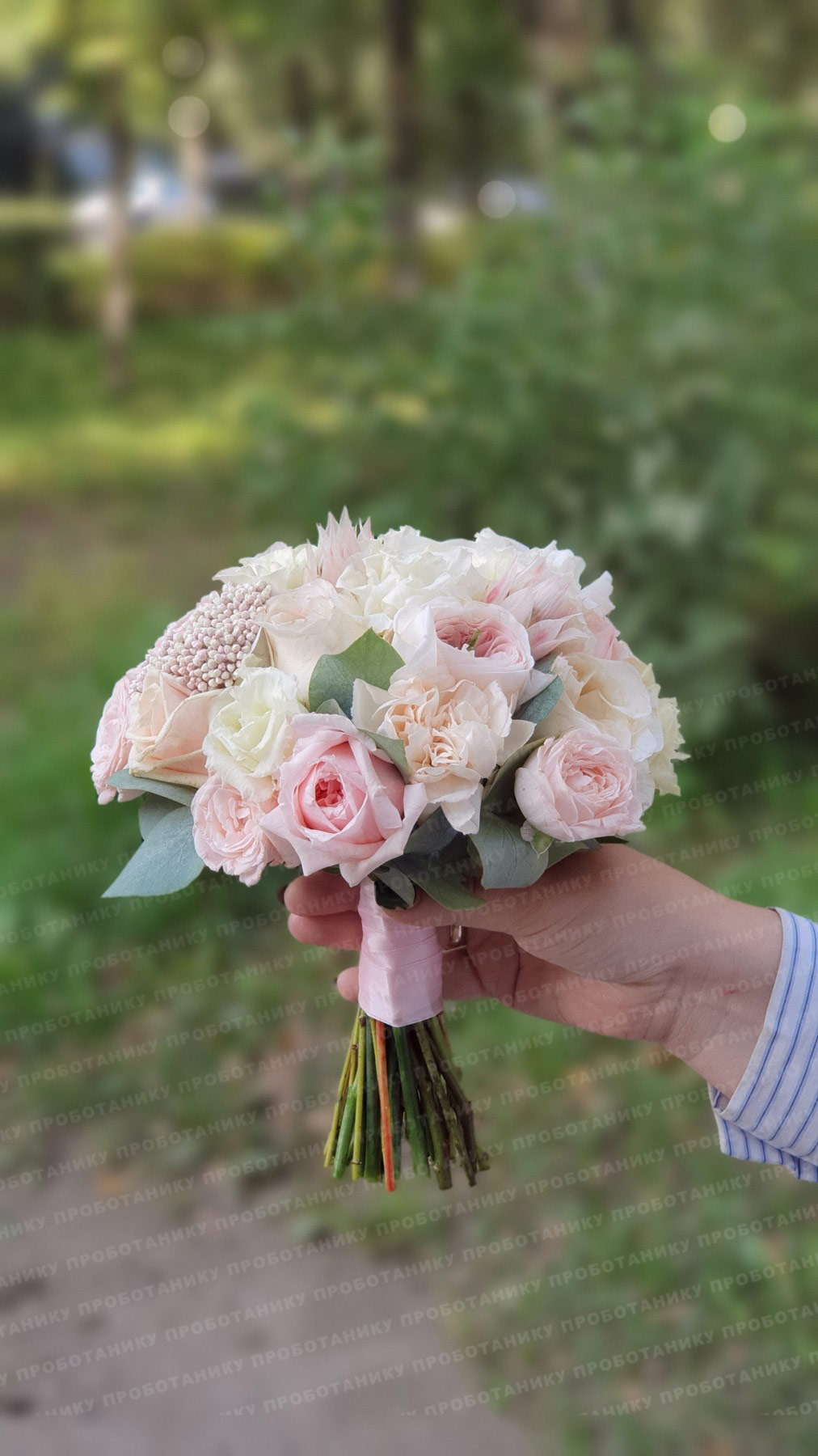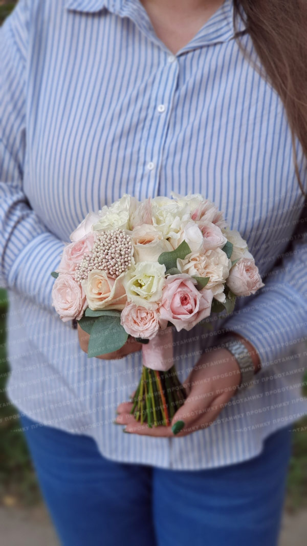 Красивый букет невесты с нежно-розовыми и белыми пионовидными розами, а также капсом, кустовыми розами и листьями эвкалипта имеет довольно большие размеры. В нем собраны три вида красивых роз- роза Чарит, роза принцесс Хитоми, роза Евгения. Он идеально круглой формы с лентой из капрона и атласа.