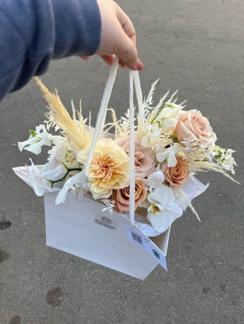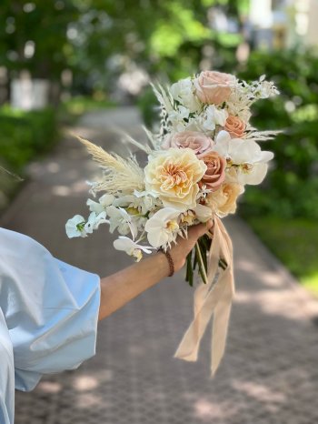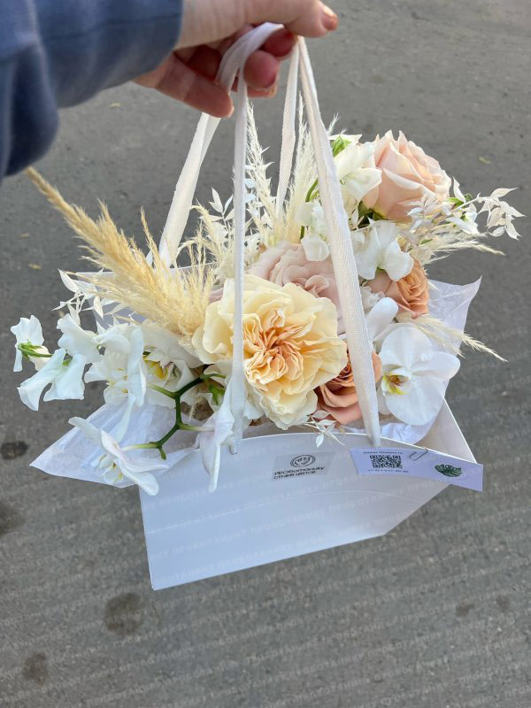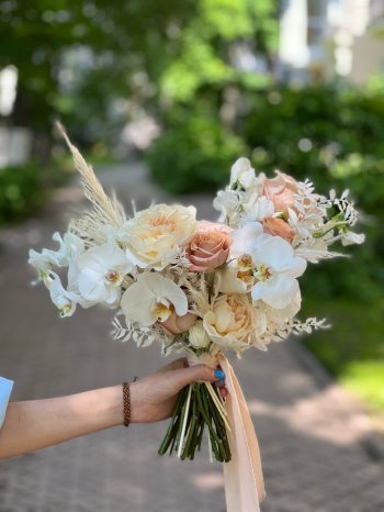 Букет невесты с орхидеями и розами Давид Остин Евгения в стильном пакете и аква-боксе от цветочном пространстве ПРОботанику.