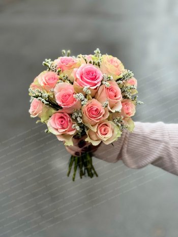 Букет невесты с розовыми розами и лимониумом классической круглой формы от флористов цветочной студии ПРОботанику. В букете используются стойкие сорта роз.
