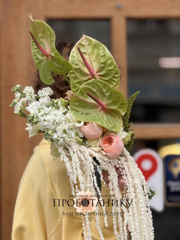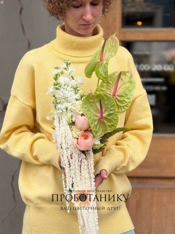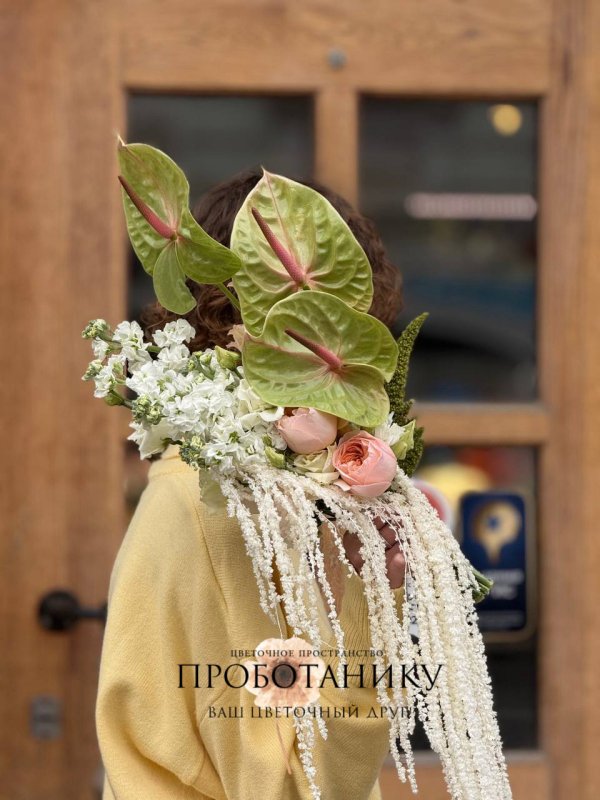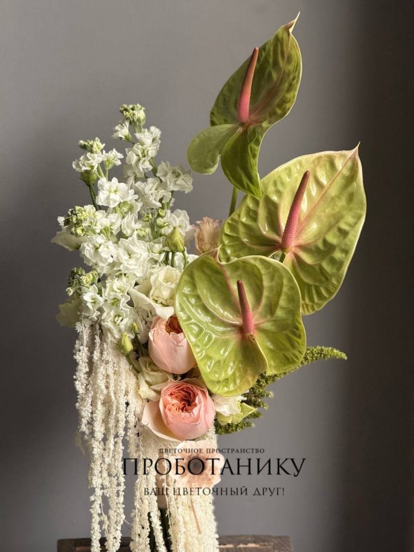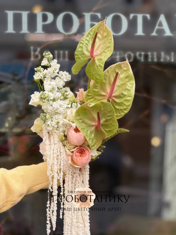 Букет невесты с зелеными антуриумами и амарантом от флористов цветочного пространства "ПРОБОТАНИКУ".