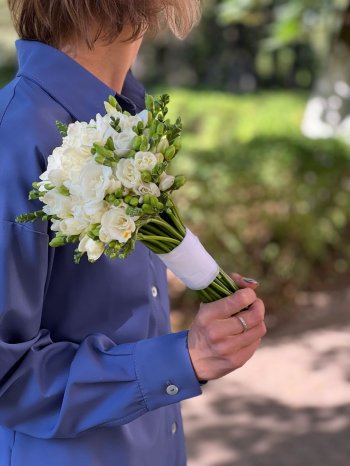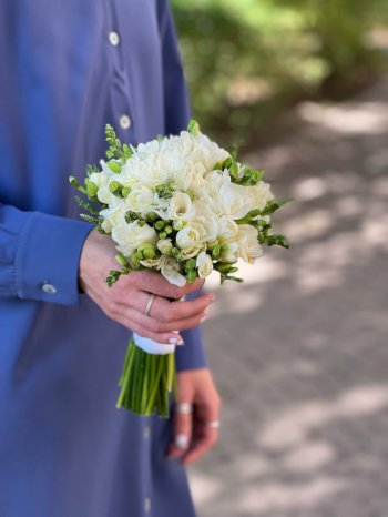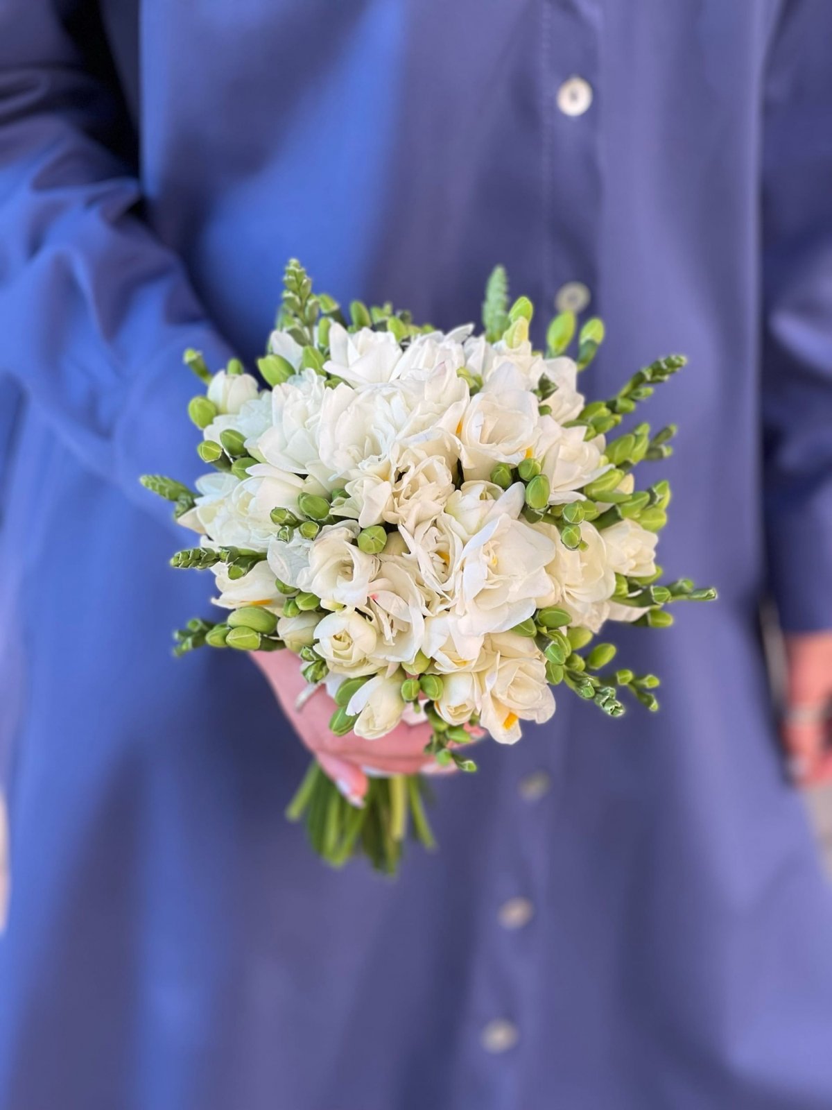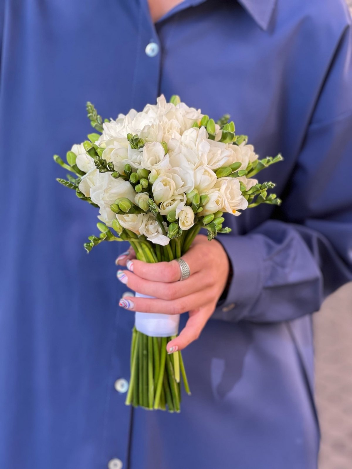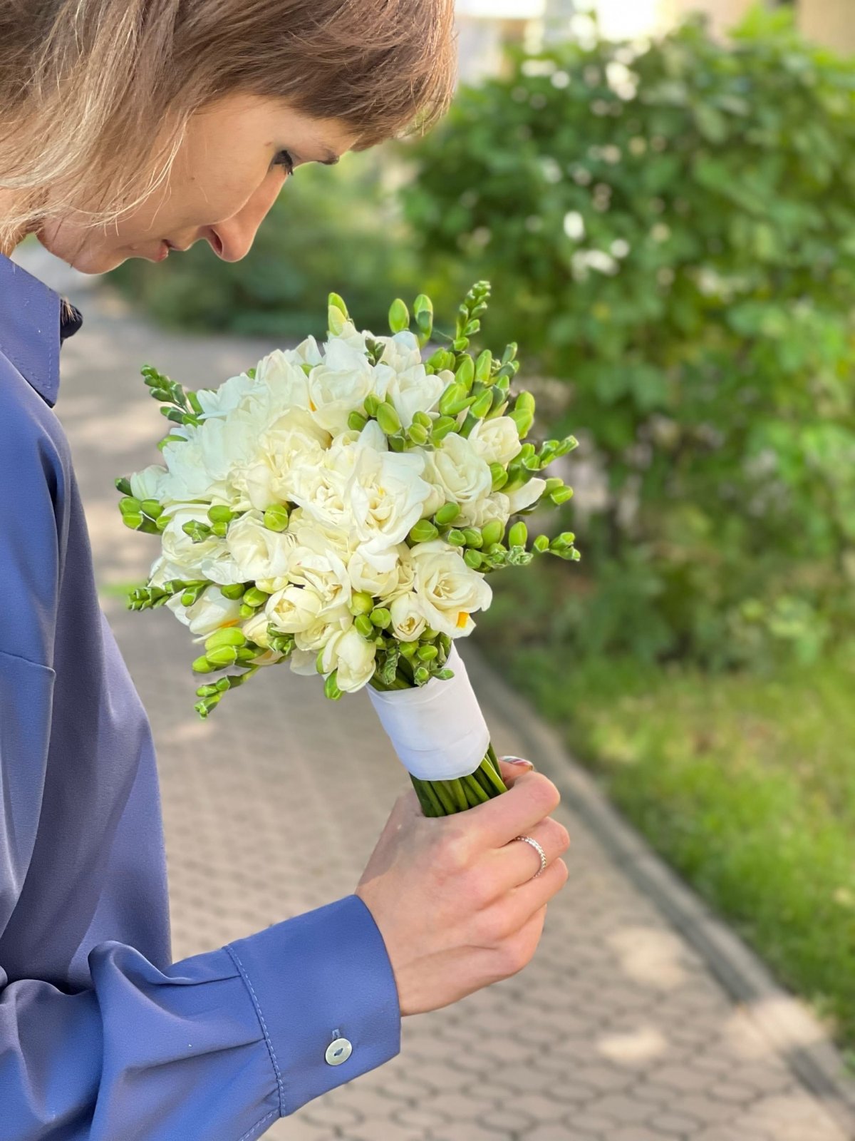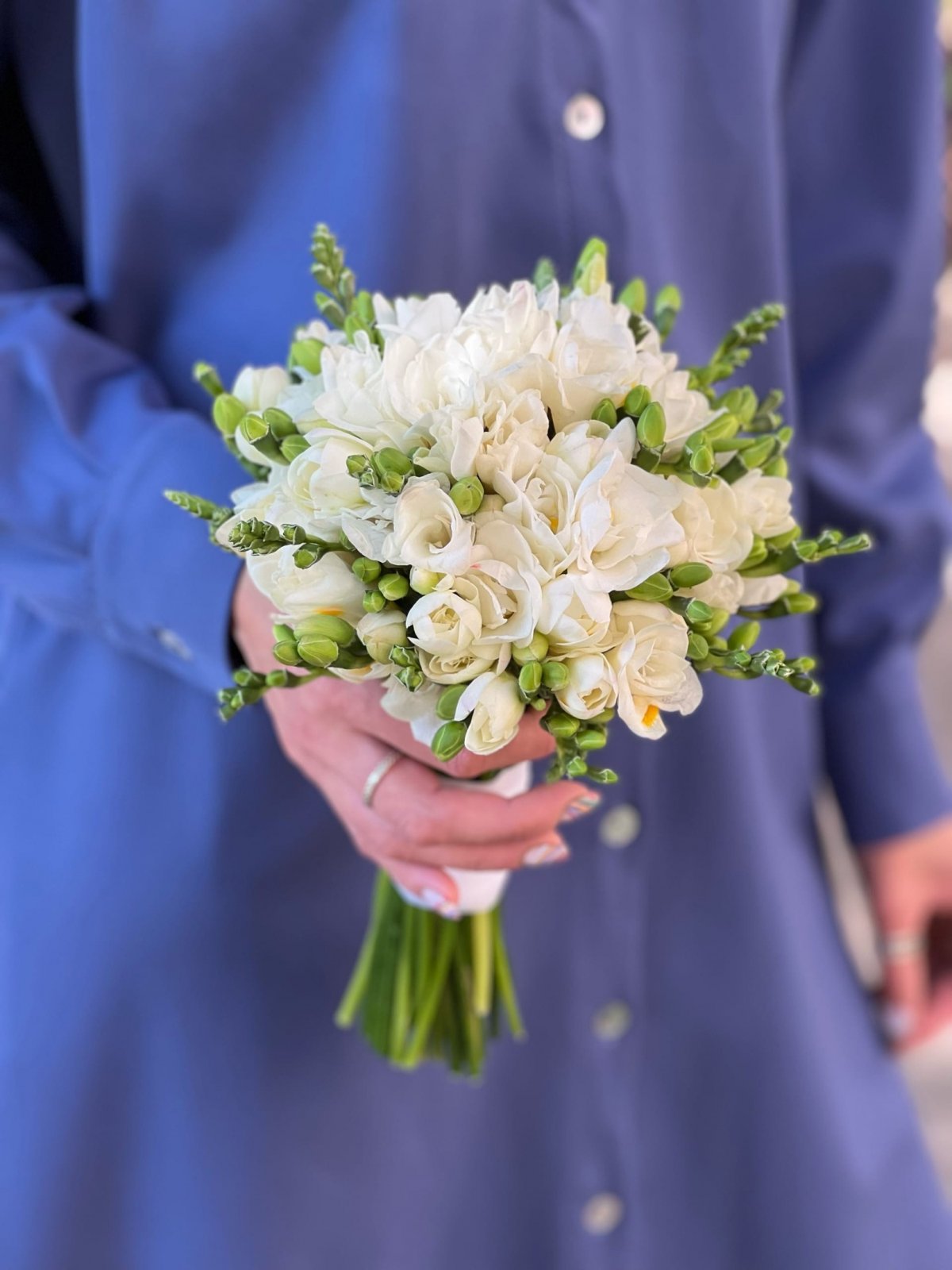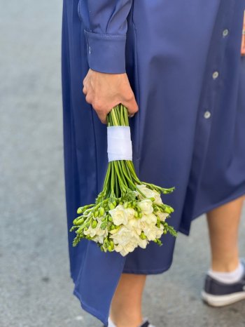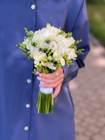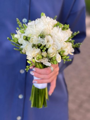 Премиум свадебный букет с белой фрезией в стильном пакете и аква-боксе от цветочном пространстве ПРОботанику. Это стильный букет невесты собранный из белой фрезии. В букете около 33 шт стеблей. Ароматный и изящный букет, не смотря на свои на не большие размеры.