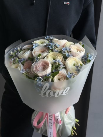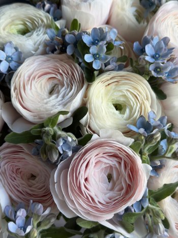 Букет из розовых ранункулюсов с незабудками в цветочном пространстве "ПРОБОТАНИКУ".