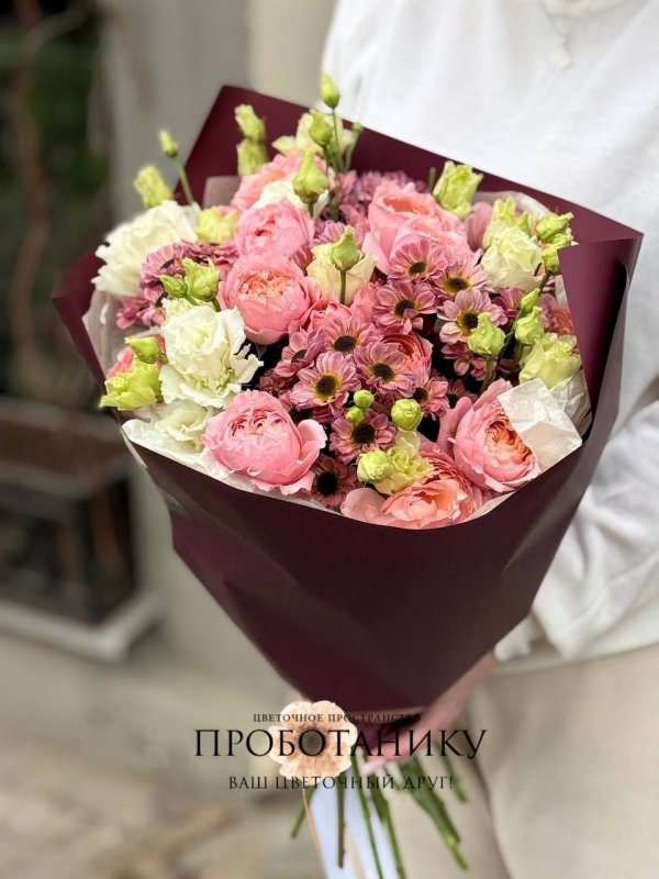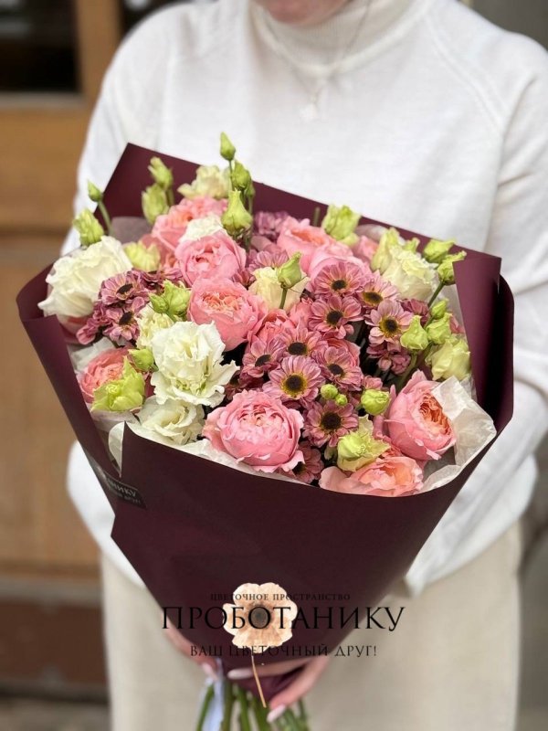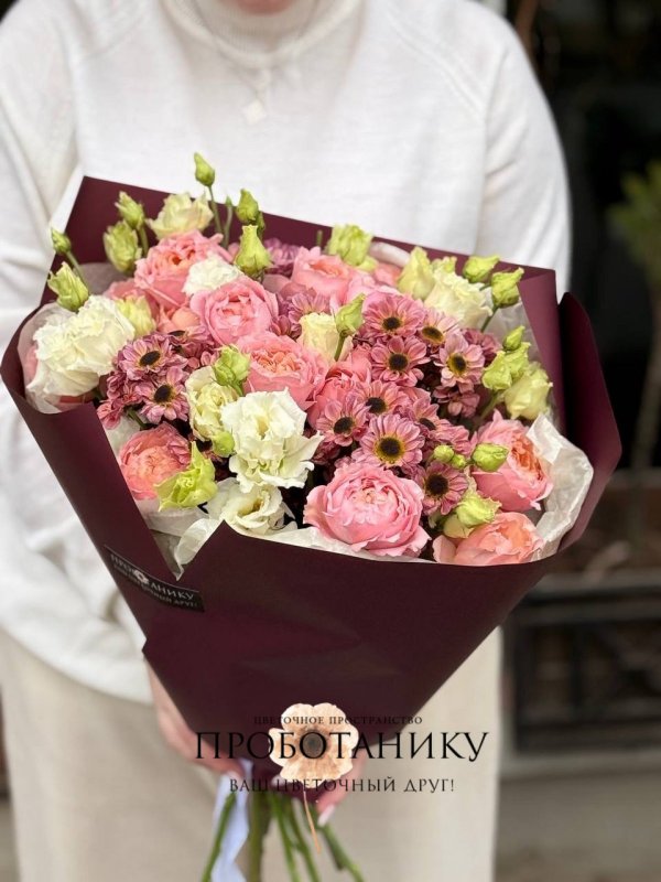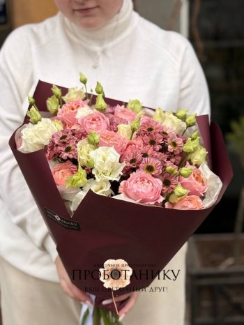 Букет с розами и кустовой хризантемой от флористов цветочного пространства "ПРОБОТАНИКУ".