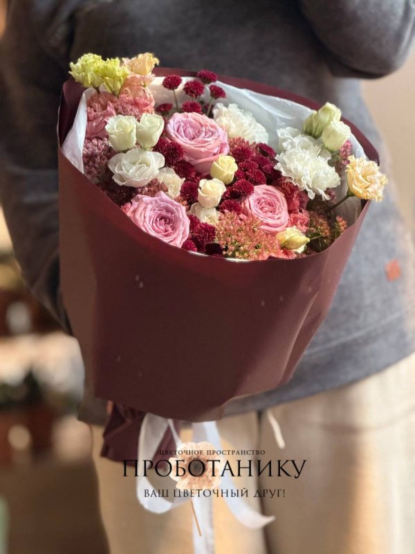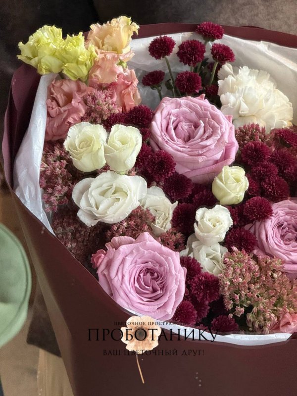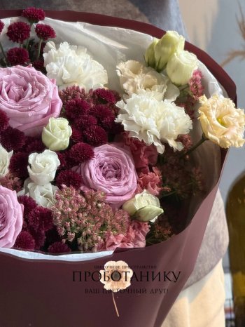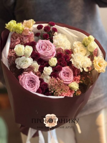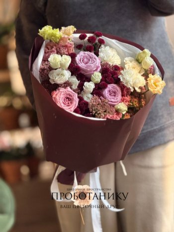 Букет с яркой кустовой хризантемой от флористов цветочного пространства "ПРОБОТАНИКУ".