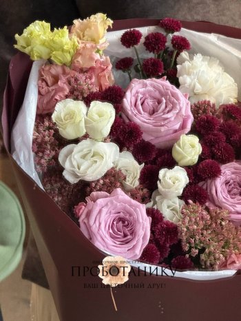 Состав букета Розы, Хризантемы, Гвоздики, Лизиантусы