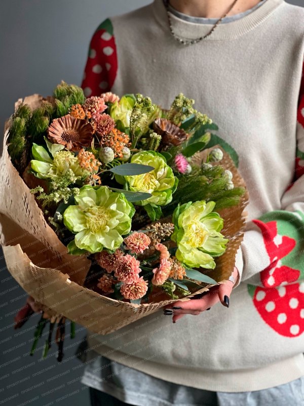 Банч-букет с зелеными розами и миксом трав от флористов цветочного пространства "ПРОБОТАНИКУ".