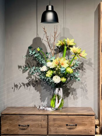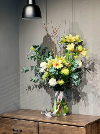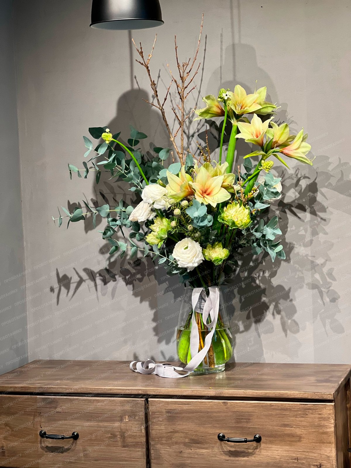 Букет в вазе в фирменной сборке от флористов цветочного пространства "ПРОБОТАНИКУ".