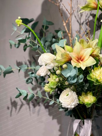 Состав букета Розы, Амариллисы, Ранункулюсы