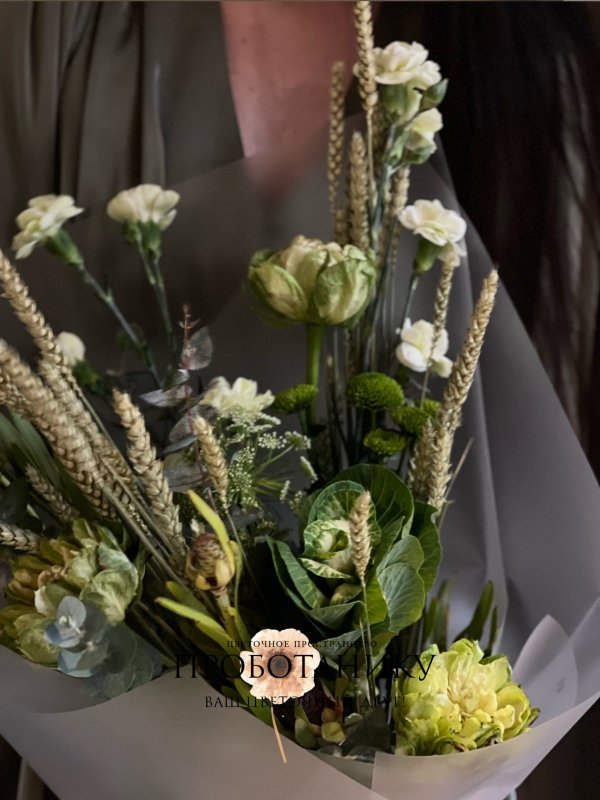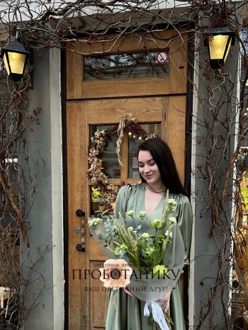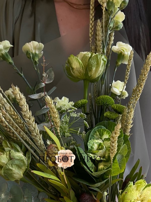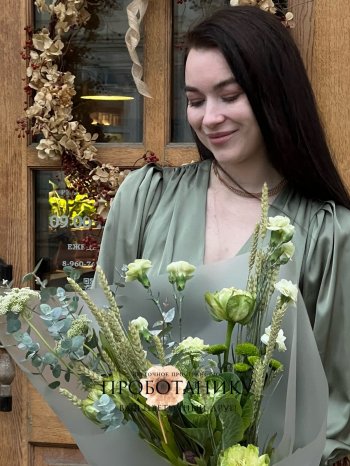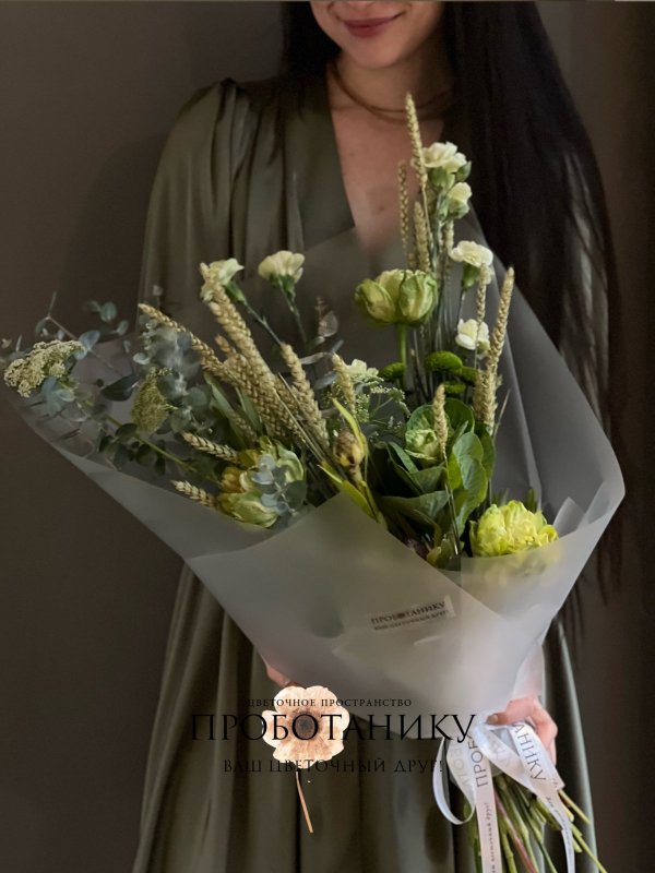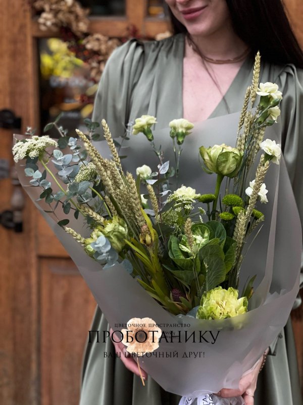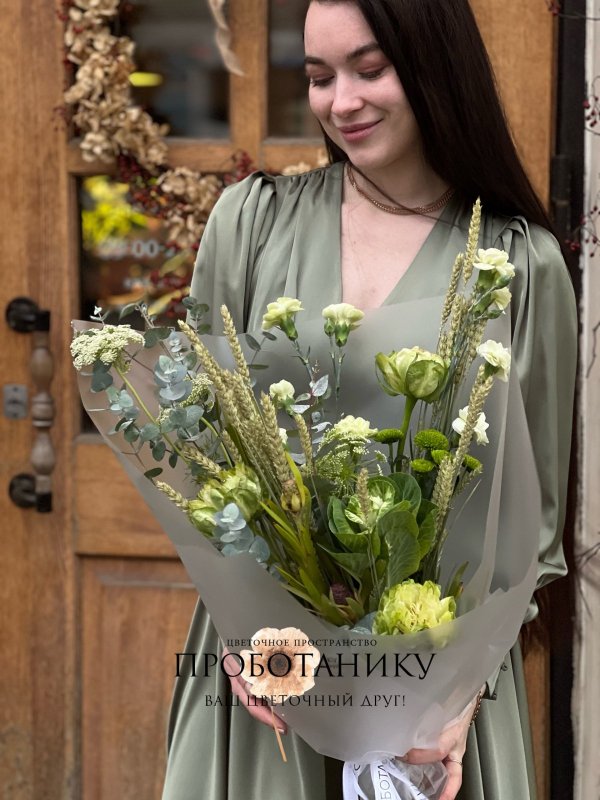 Фирменная зеленая охапка цветов от флористов цветочного пространства "ПРОБОТАНИКУ".