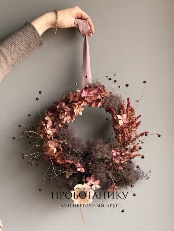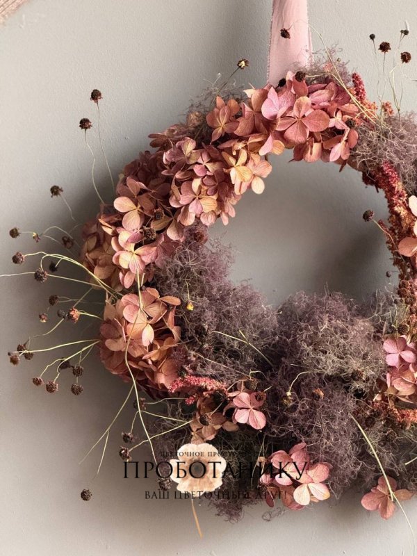 Декоративное украшение с гортензией и сухоцветами на дверь от флористов цветочного пространства "ПРОБОТАНИКУ".
