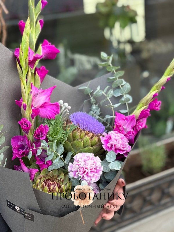 Букет с фиолетовыми гладиолусами от флористов цветочного пространства "ПРОБОТАНИКУ".