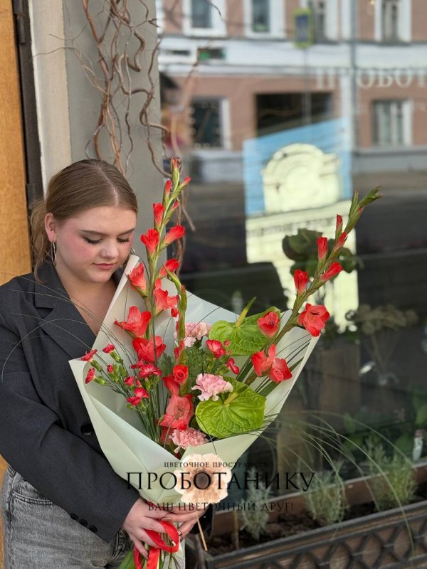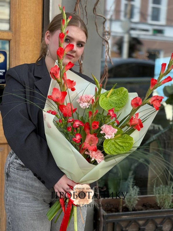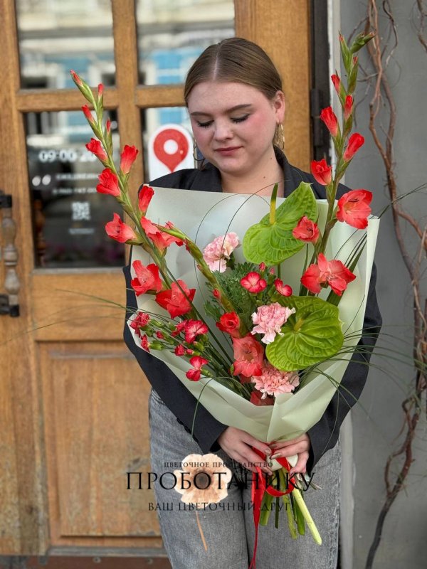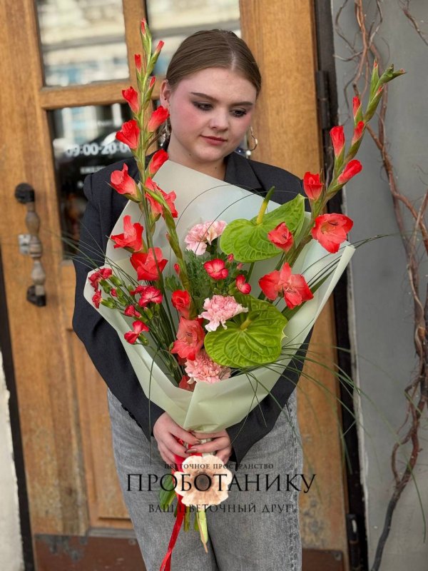 Букет с гладиолусами и антуриумами от флористов цветочного пространства "ПРОБОТАНИКУ".