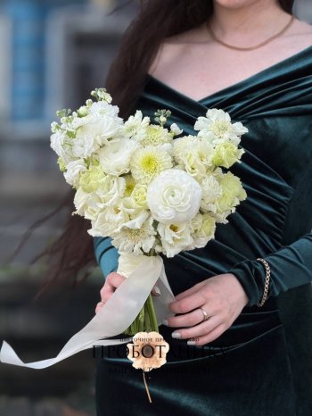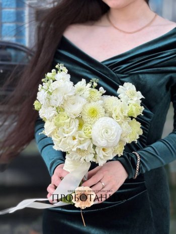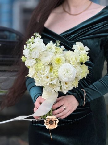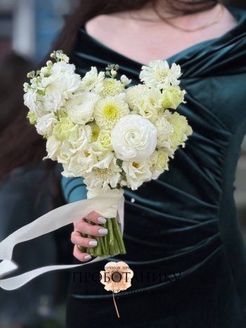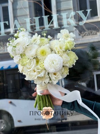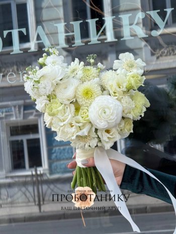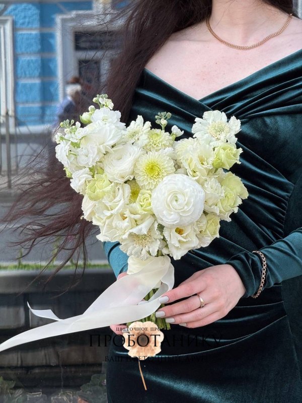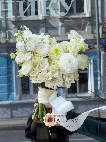 Букет невесты с белыми георгинами и скабиозой от флористов цветочного пространства "ПРОБОТАНИКУ".