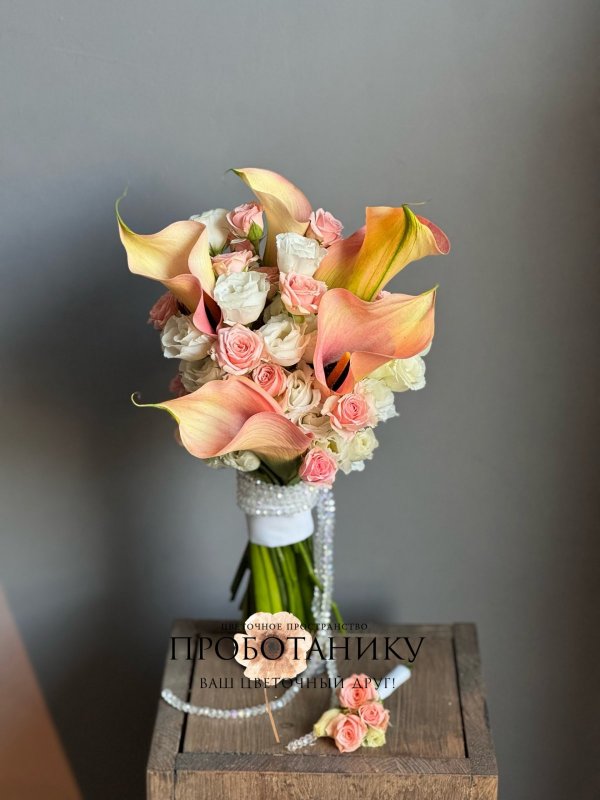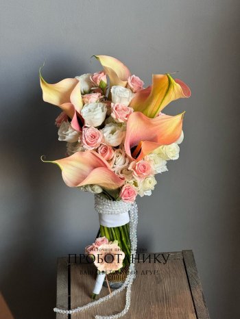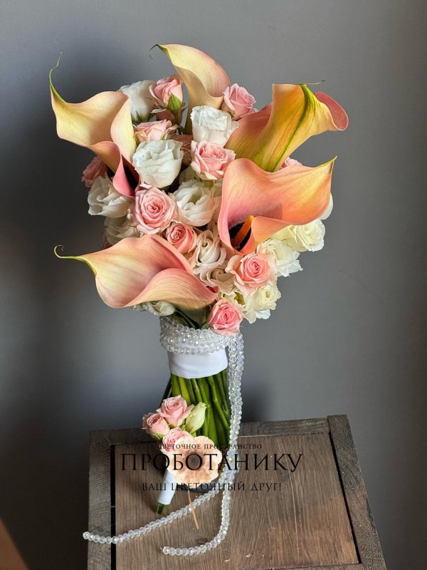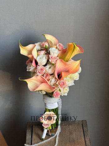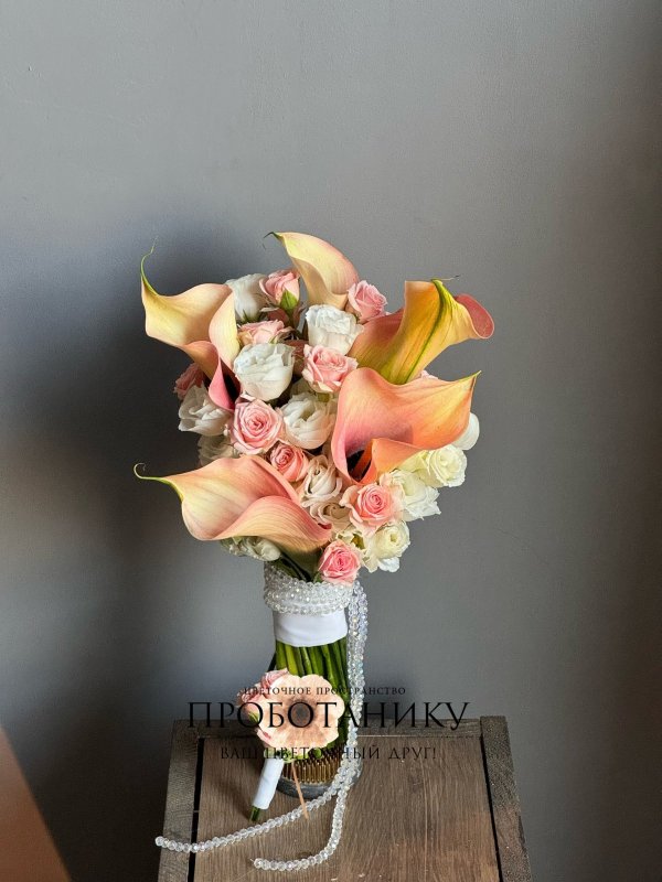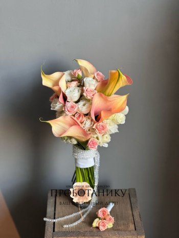 Букет невесты с оранжевыми каллами от флористов цветочного пространства "ПРОБОТАНИКУ".