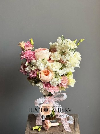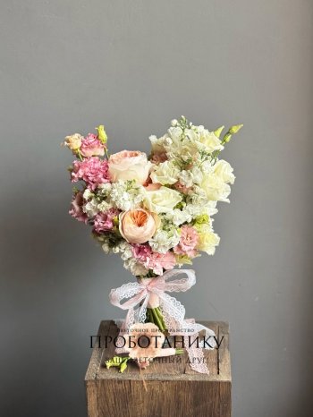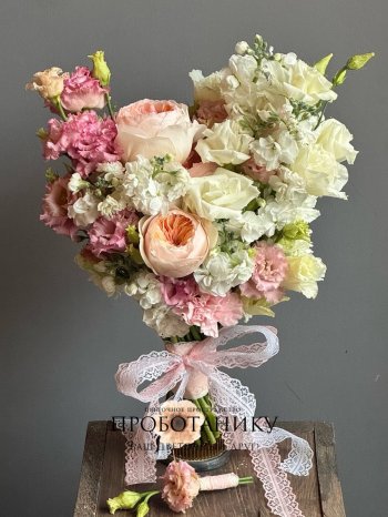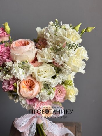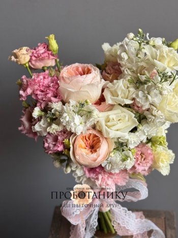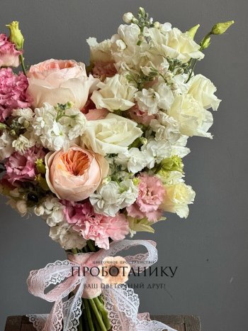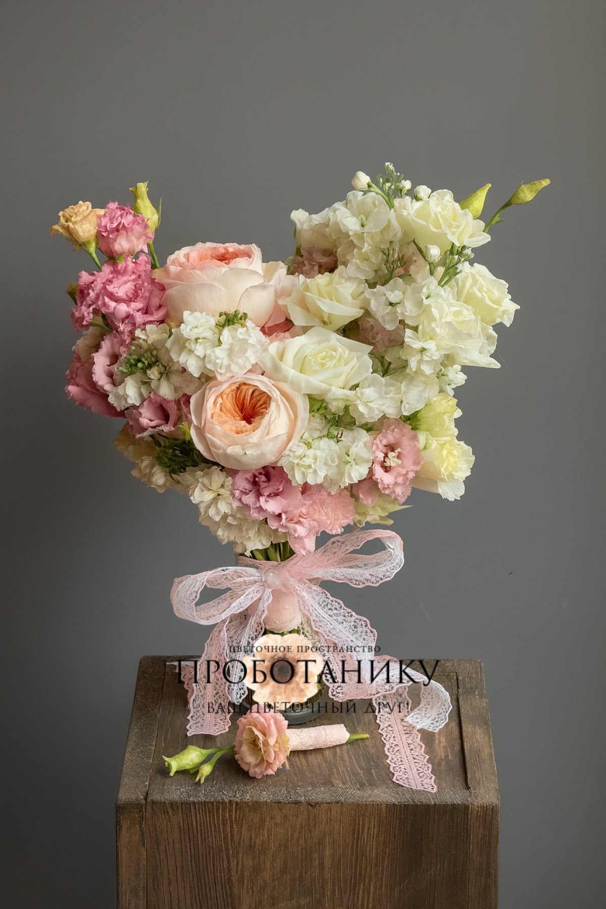 Букет невесты с пионовидными розами от флористов цветочного пространства "ПРОБОТАНИКУ". Свадебные букеты переполнены нежностью и этот букет не исключение. Лента кружево в сочетании белого и розового дополняет образ букета.