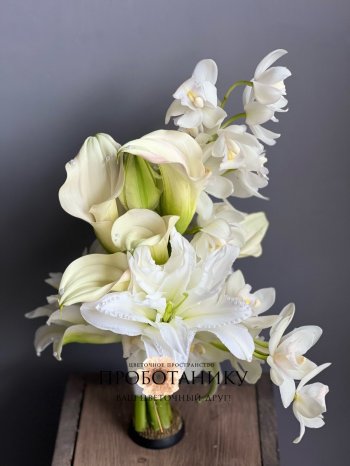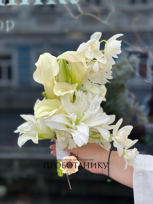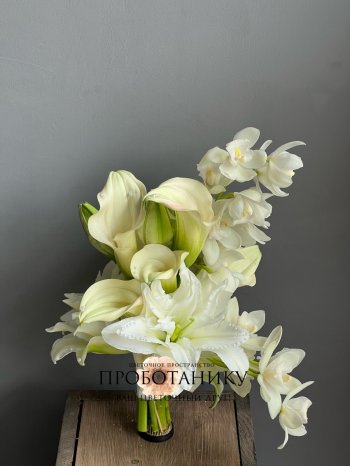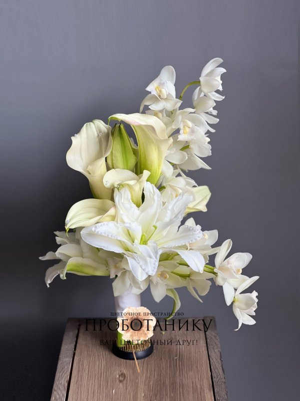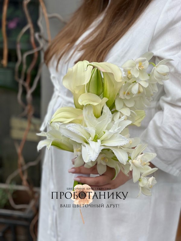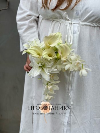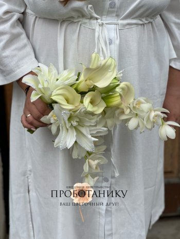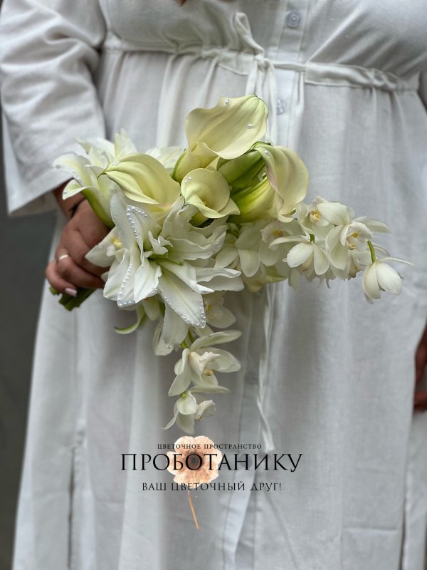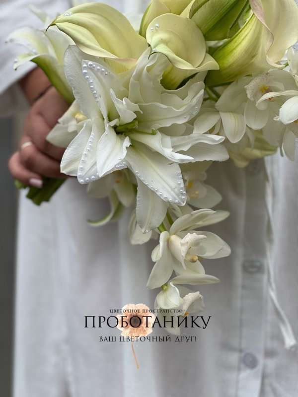 Букет невесты с цимбидиумом и лилиями декорированными жемчугом от флористов цветочного пространства "ПРОБОТАНИКУ".