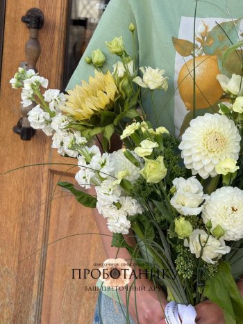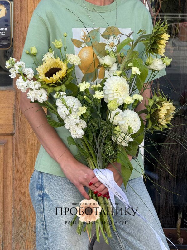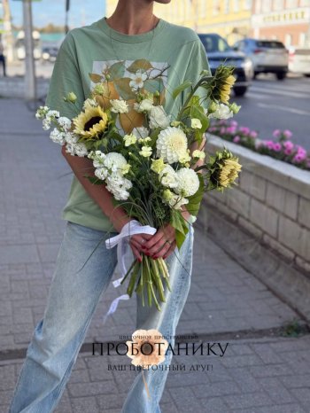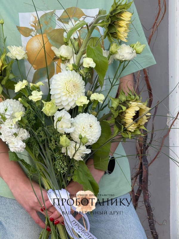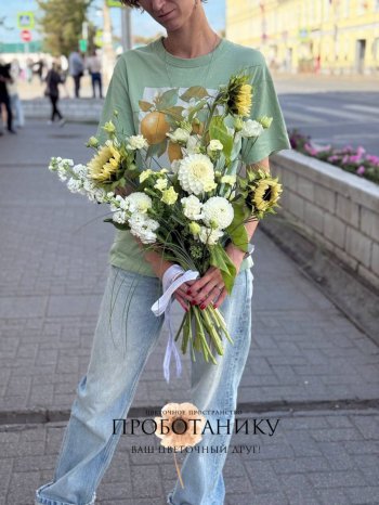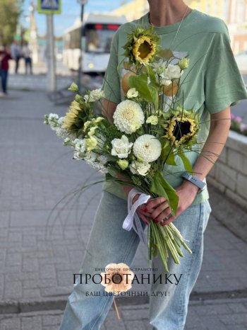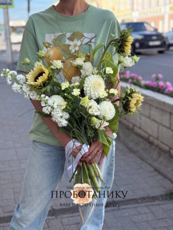 Букет без упаковки с зелеными подсолнечниками от флористов цветочного пространства "ПРОБОТАНИКУ".
