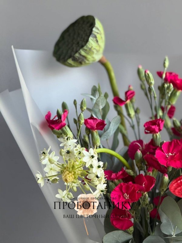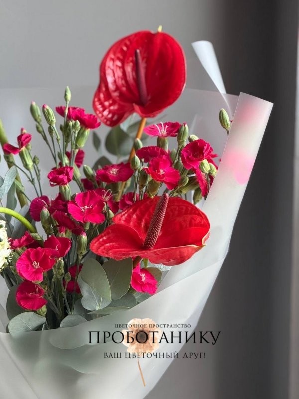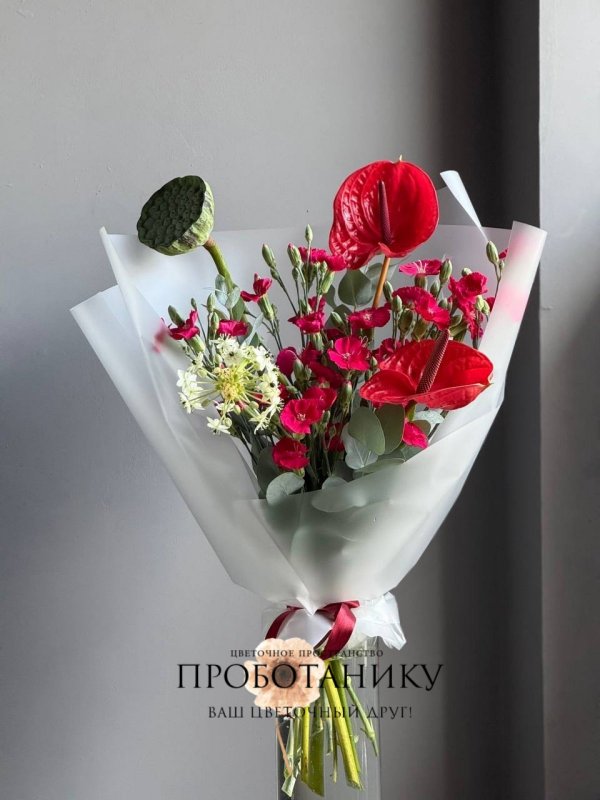Букет с антуриумами и нелюмбо от флористов цветочного пространства "ПРОБОТАНИКУ".