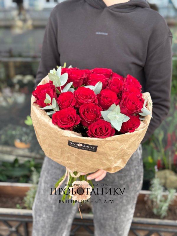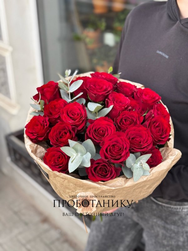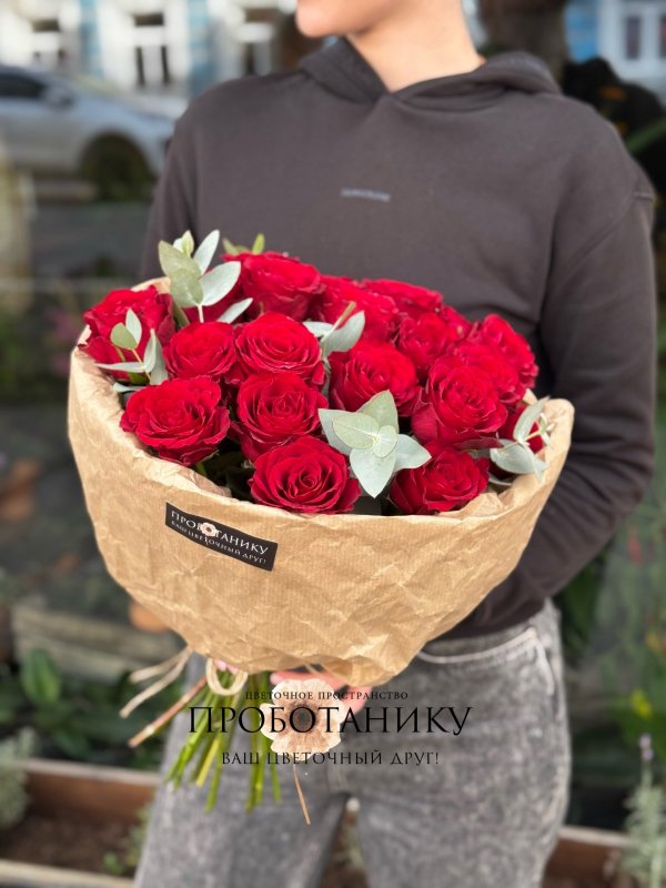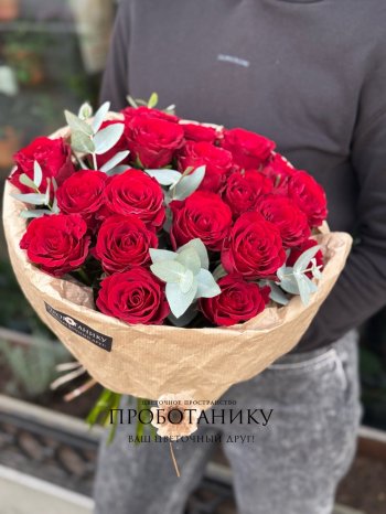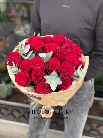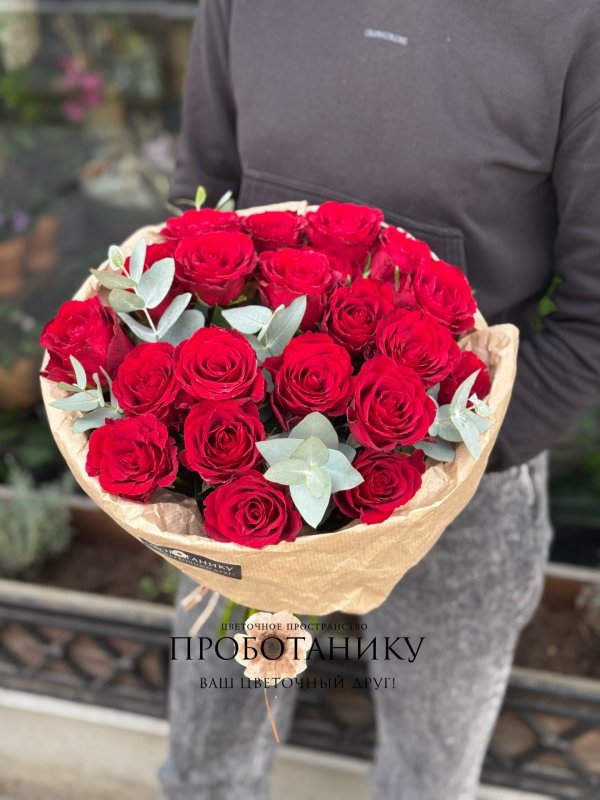 Букет с красными розами и эвкалиптом от флористов цветочного пространства "ПРОБОТАНИКУ".