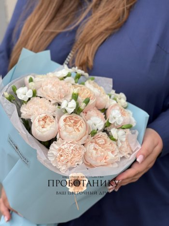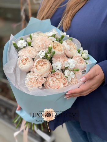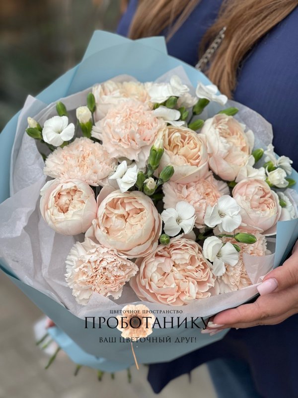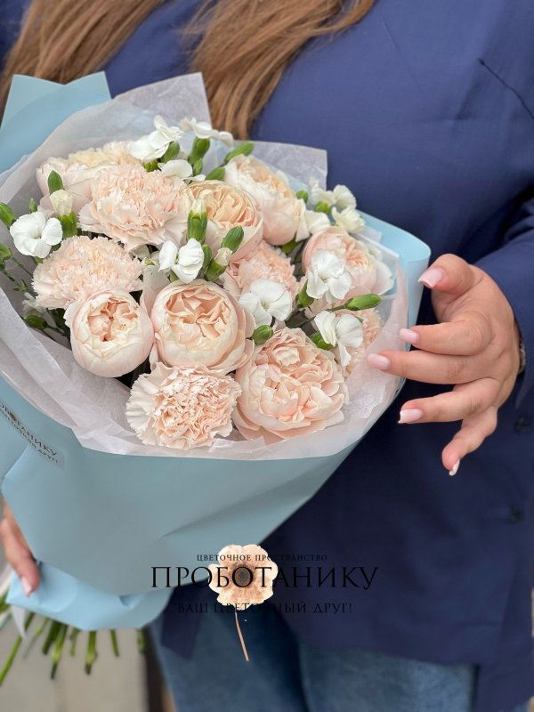 Букет с пионовидными розами и кустовыми гвоздиками от флористов цветочного пространства "ПРОБОТАНИКУ".