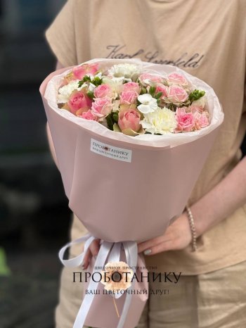 Букет с розами и кустовыми гвоздиками