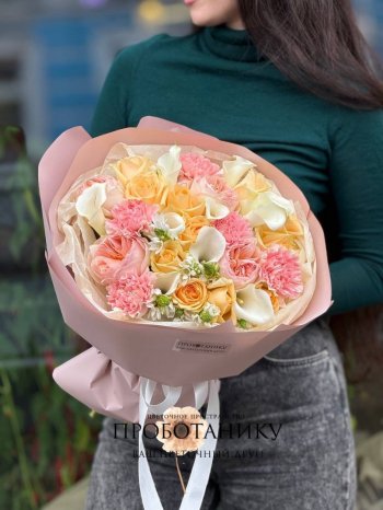 Круглый букет с пионовидными розами и каллами