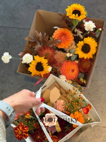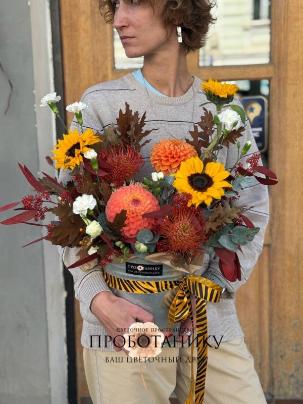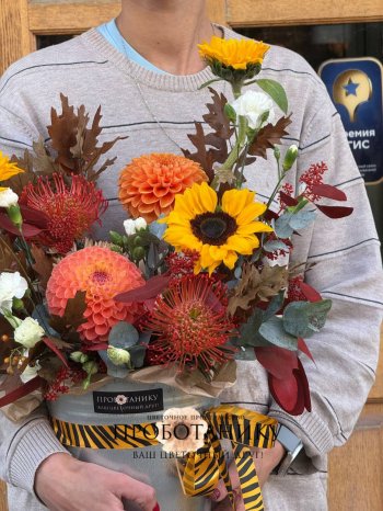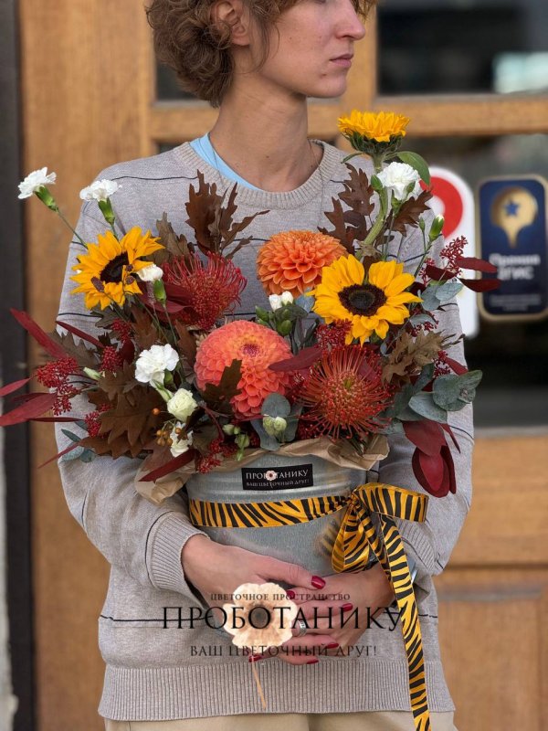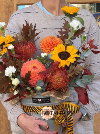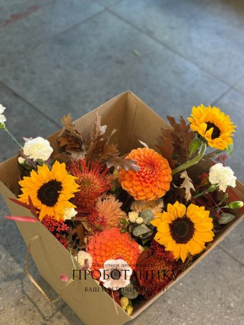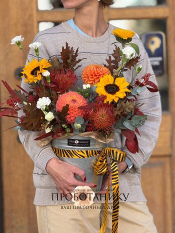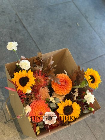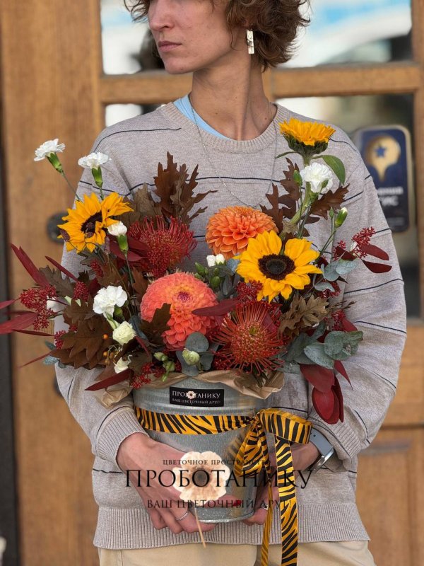 Композиция с подсолнечниками в ведерке от флористов цветочного пространства "ПРОБОТАНИКУ".