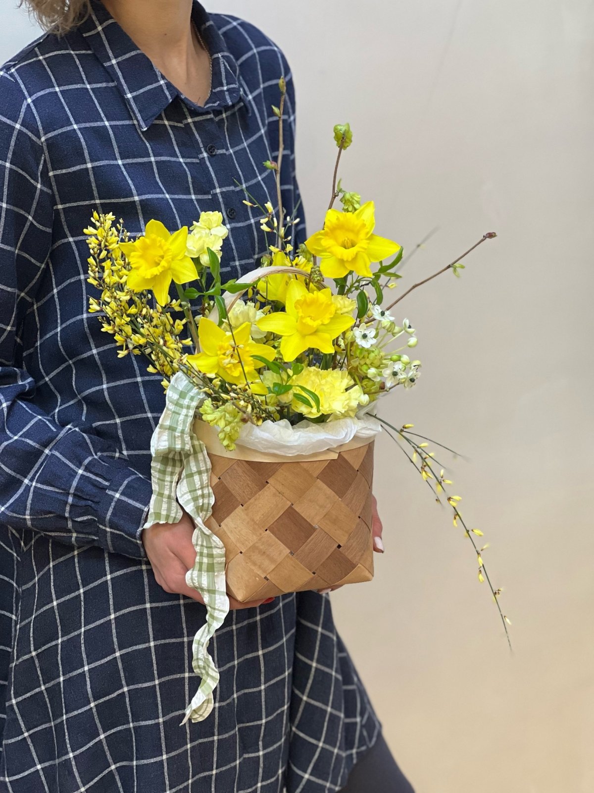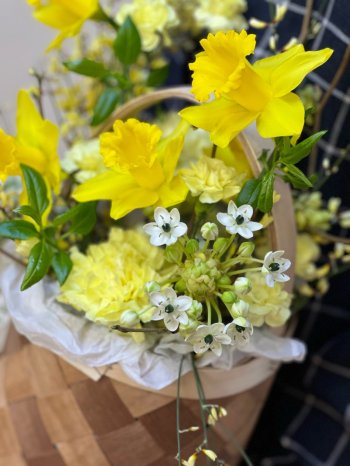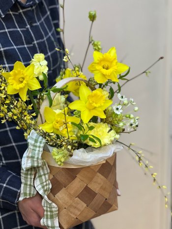 Лукошко солнечных цветов, размер M от флористов цветочной студии ПРОботанику. Соберем для вас букеты и композиции на любое событие. Букеты из тюльпанов, ирисов, гиацинтов, кустовых ромашек к 8 марта.