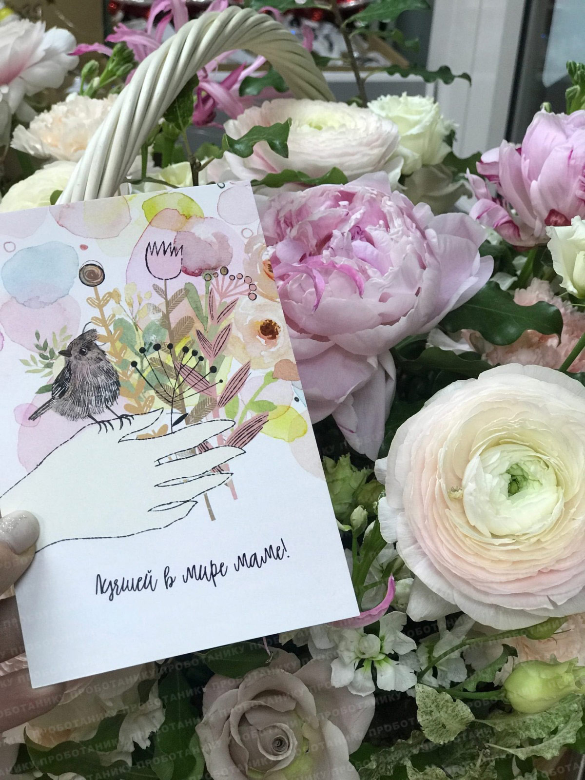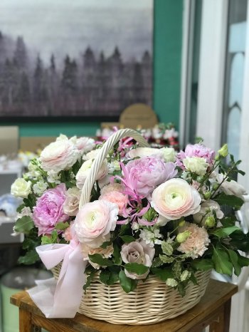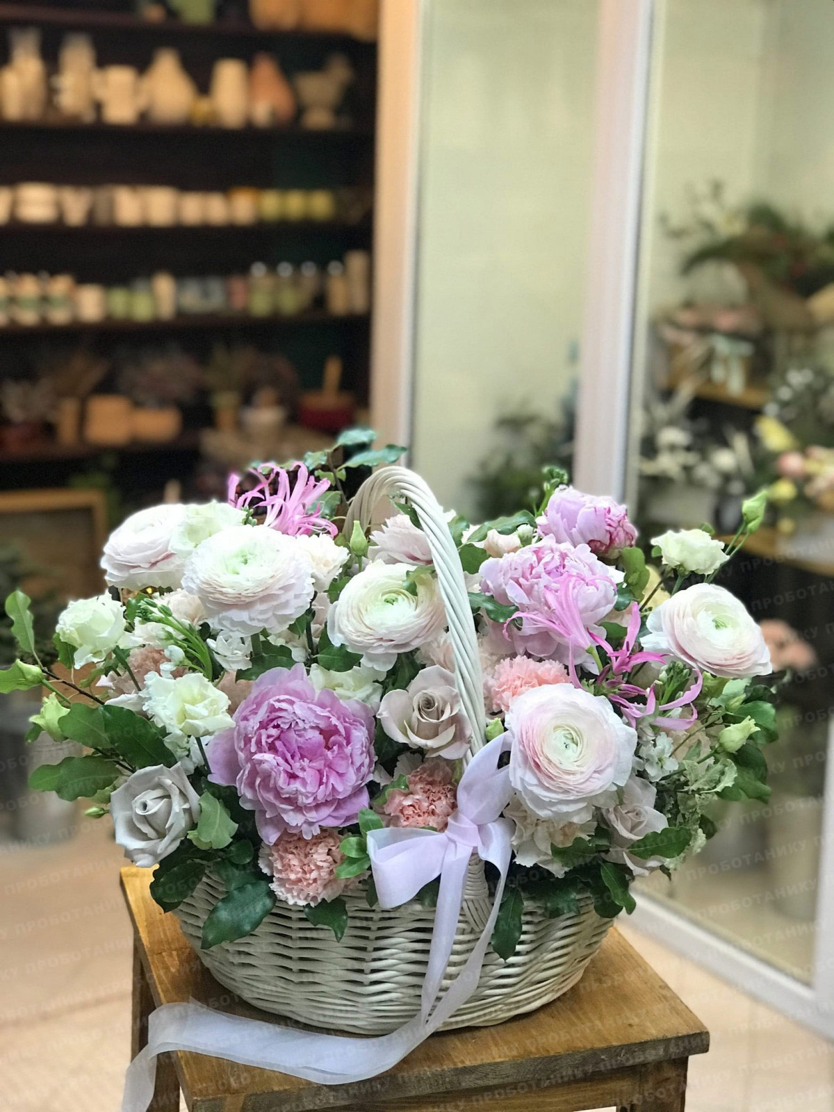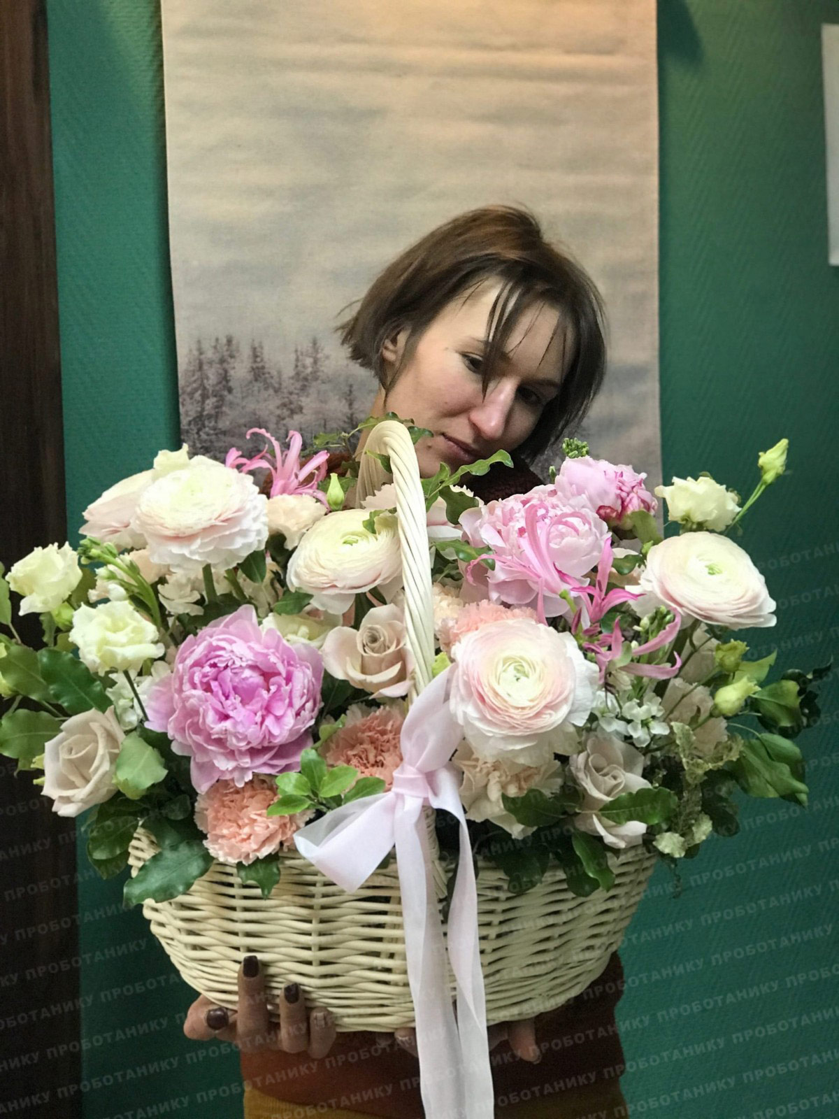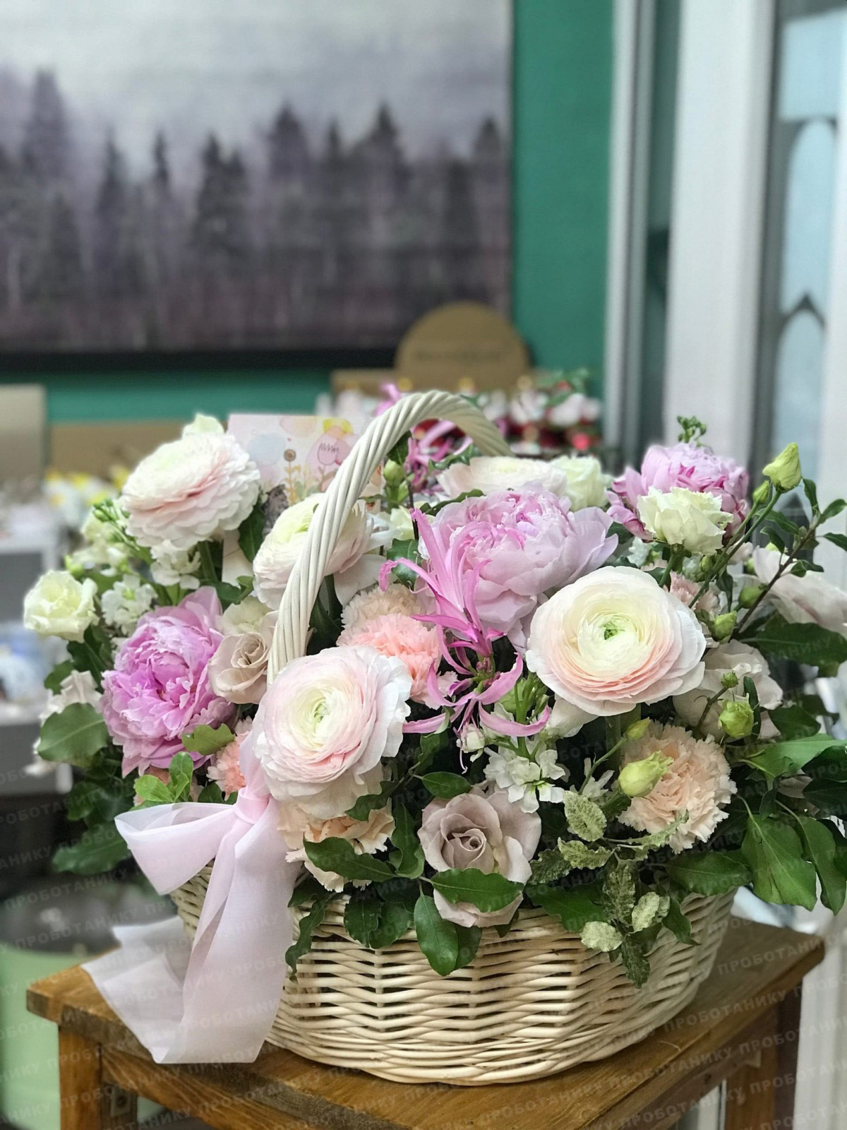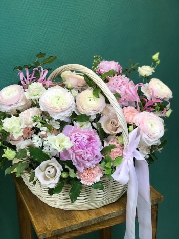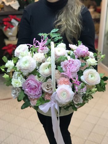 Цветочная корзина с пионами, пионовидными розами и ранункулюсами