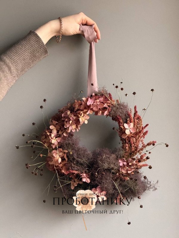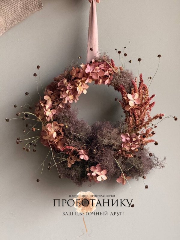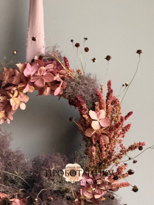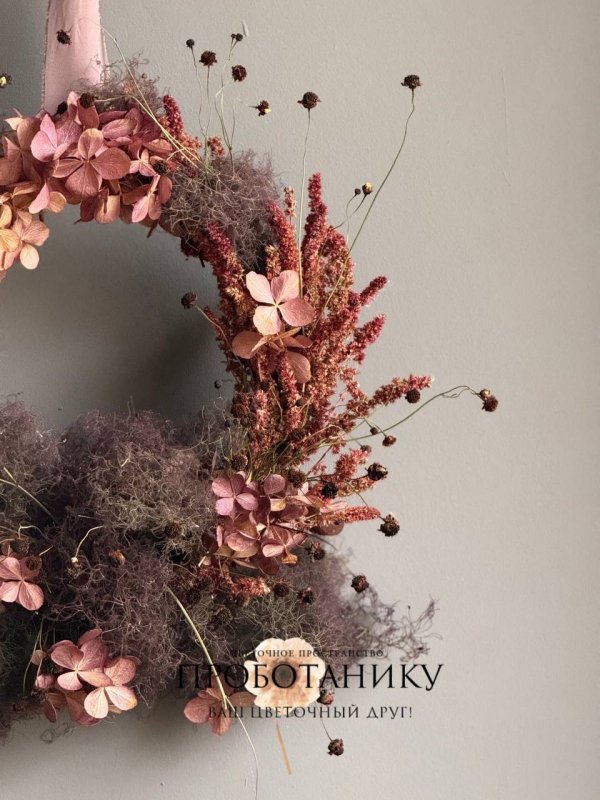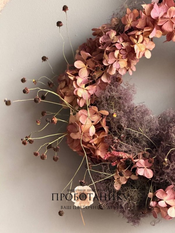 Декоративное украшение с гортензией и сухоцветами на дверь от флористов цветочного пространства "ПРОБОТАНИКУ".